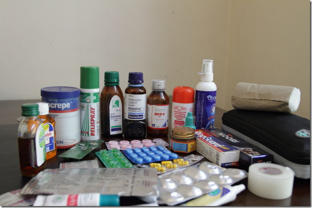 As a thumb rule, all travelers carry a first aid kit. Some of us carry full fledged ones while others carry light ones. Below is a list that makes up my first aid kit. This has evolved over a long period of travel and includes the essential medical care for backpacking and remote trips that don’t have easy access to hospitals and medical facilities. I pack my medicines in a small medicine pouch and the rest of the stuff in zip loc bags and prefer not to include anything that breaks.